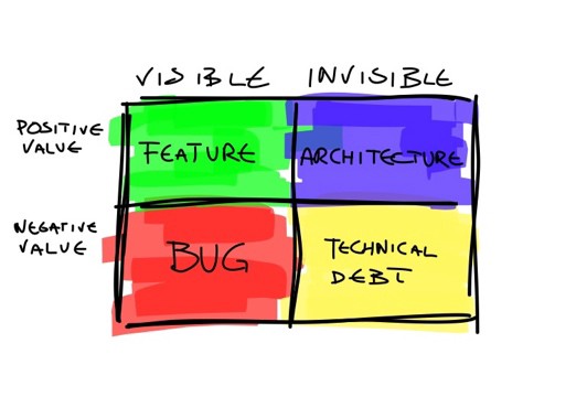 Technical Debt, 아키텍처, 기능, 버그 관계의 그림이다.