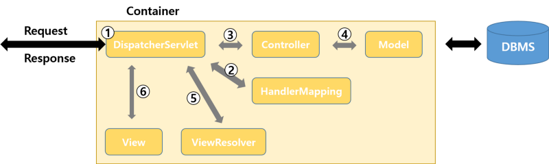 - 4) Controller는 Model을 이용하여 데이터 처리를 한다. 그 후 ModelAndView 객체에 Model 정보와 View 정보를 저장하여 리턴한다.