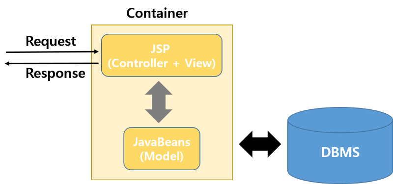 Model 1에서는 2개의 파일을 개발한다. JSP 파일을 통해 Controller와 View를 작성하고 JavaBean (Java 객체)를 통해 Model을 작성한다. JSP 파일이 java와 markup(HTML / CSS 등) 코드가 같이 있기 때문에 코드가 복잡해지고 유지 보수가 어렵게 된다.