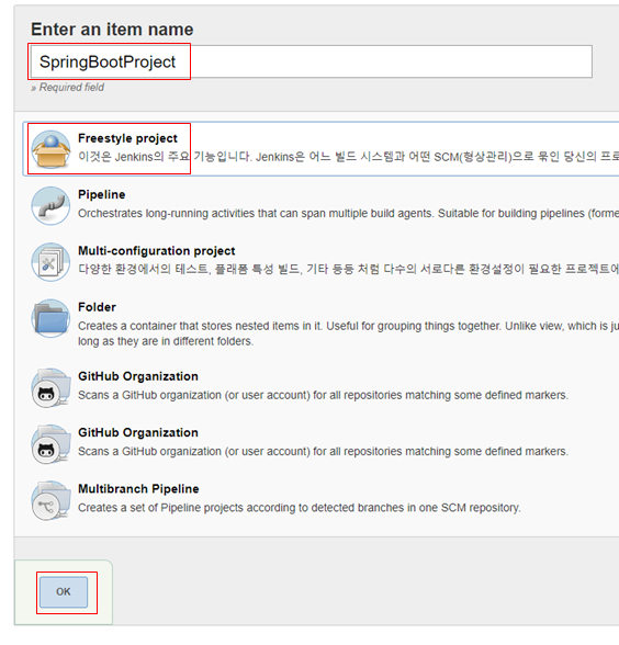 Enter an item name에 원하는 item 이름을 입력하고, Freestyle project를 선택합니다.