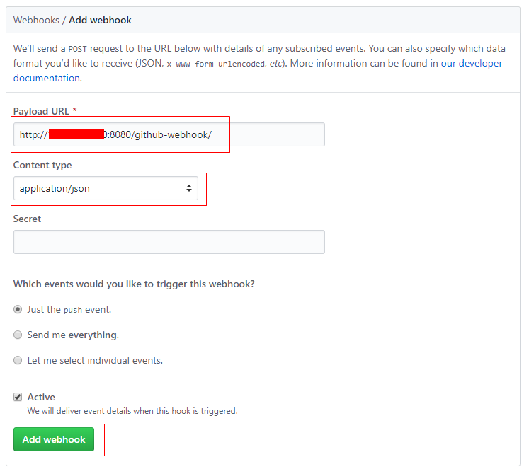 payload URL에는 http://jenkins URL:8080/github-webhook/ 형식으로 입력합니다.