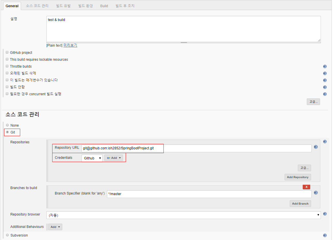 이제 연동할 Github repository를 설정합니다. 저는 spring boot를 공부할 때 생성한 repository를 사용하겠습니다.