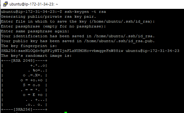 Enter를 눌러 넘어가면 다음과 같이 key가 만들어집니다. 이때 id_rsa, id_rsa.pub이 생성됩니다.