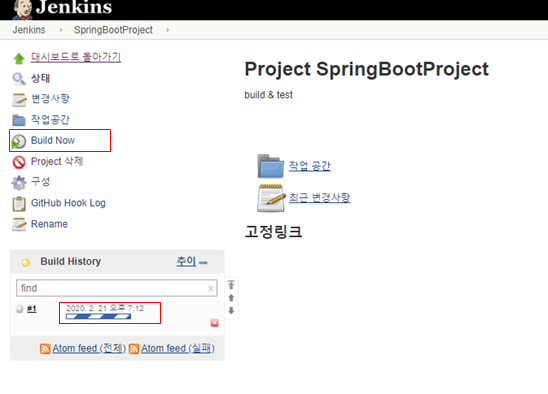Build Now를 통해 수동으로 Build를 할 수 있습니다.