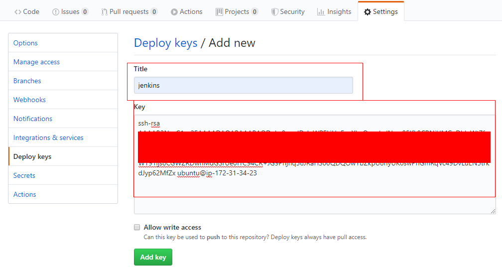 cat /home/ubuntu/.ssh/id_rsa.pub 명령어를 통해 이전에 생성한 id_ras.pub을 복사하여 key에 붙여 넣습니다.