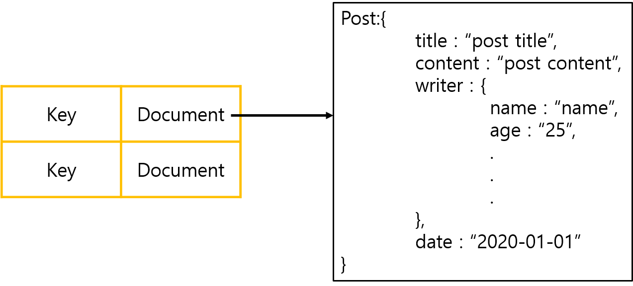 Document는 XML, Json과 같은 구조화된 데이터 타입으로 복잡한 계층 구조가 가능하다.