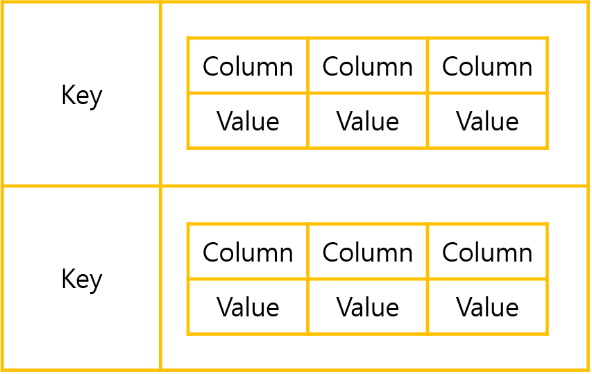 NoSQL에서는 테이블의 스키마가 유독적이다. RDB와 다른게 Key에 해당하하는 필드가 동일한 타입이며 mandatory인 필드이면 된다. Value에 해당하는 컬럼들은 타입/이름이 달라도 되며 생략 가능하다.