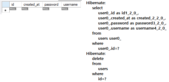 testDeleteUser() : 삭제할 엔티티를 영속성 컨텍스트에 올리기 위해 select가 실행되고 delete가 실행된다.