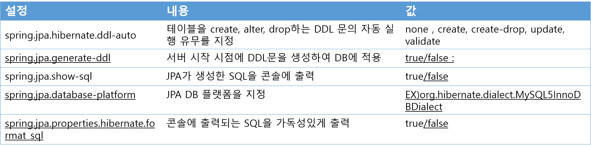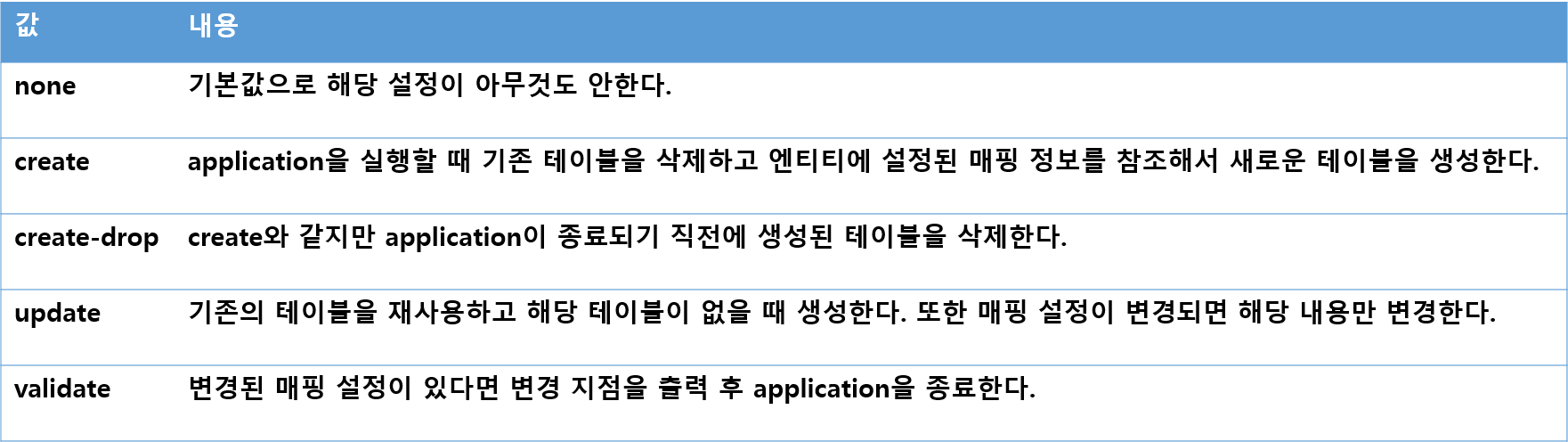 spring.jpa.hibernate.ddl-auto의 값에 따른 설정 내용이다.
