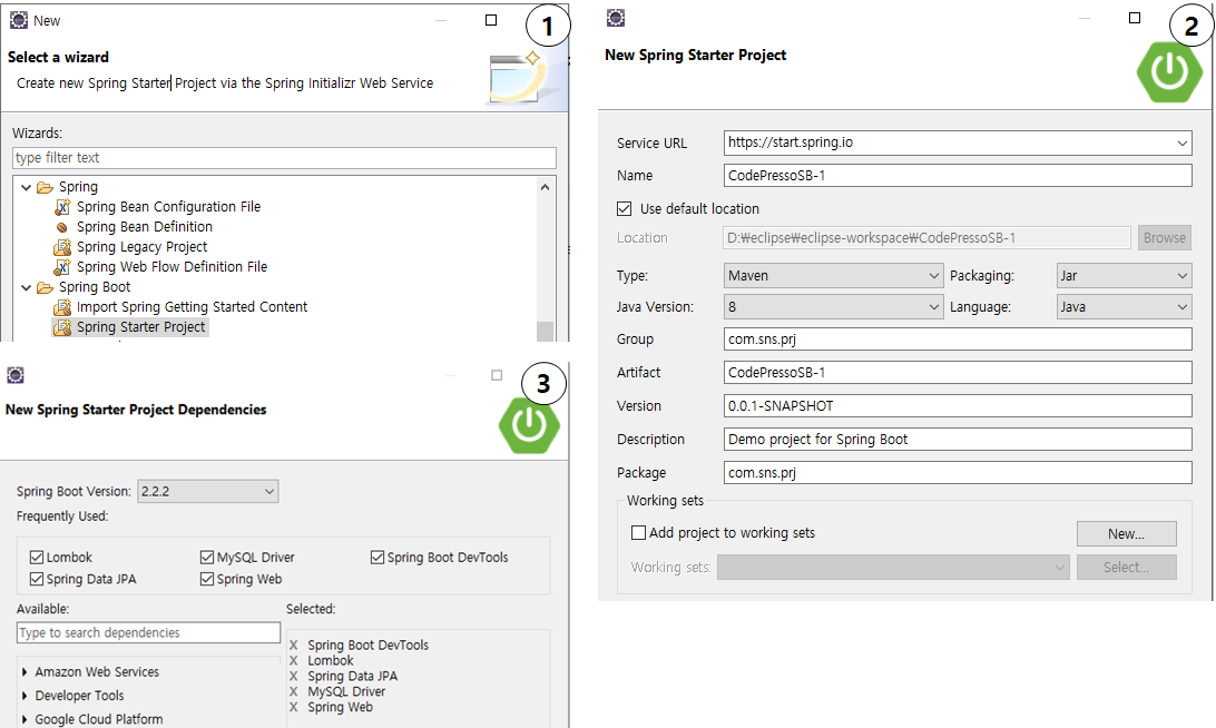 - eclipse에서 spring starter project로 project를 생성한다.