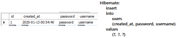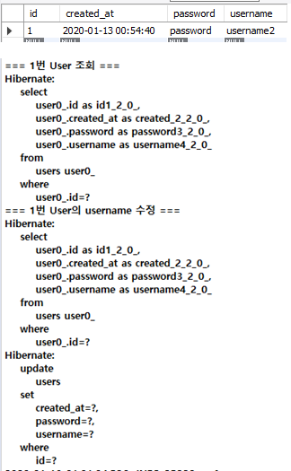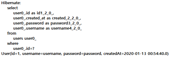 testInsertUser() : @CreationTimestamp을 사용했기 때문에 created_at에 자동으로 날짜와 시간이 저장되었고 콘솔에서 쿼리가 실행된 모습을 볼 수 있다.