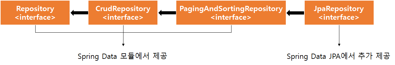 Respoitory의 상속 구조이다. Repository에는 거의 기능이 없으며 CRUD 기능은 CrudRepository에서 제공하며 페이징 처리가 필요한 경우 PagingAndSortingRepository를 사용한다. 마지막으로 Spring Data JPA에서 제공한 기능을 사용하려면 JpaRepository를 사용하면 된다.