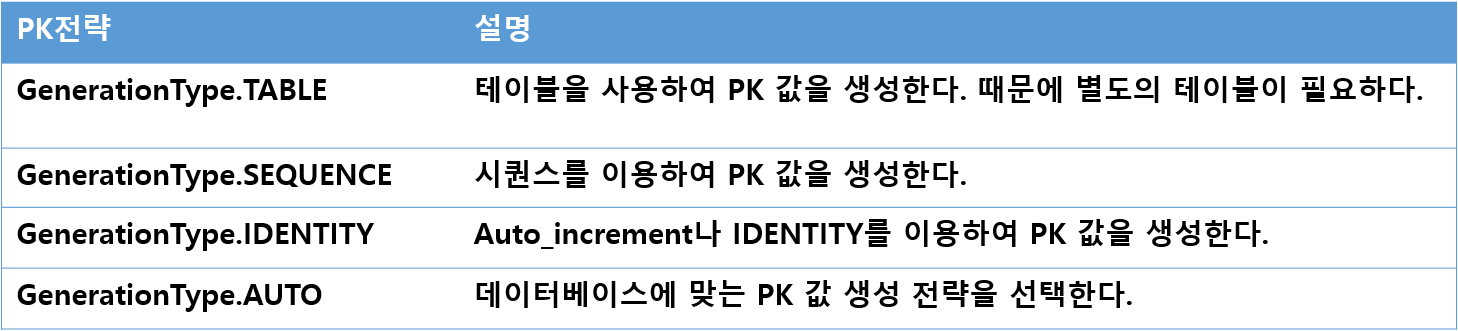 - @GeneratedValue는 @Id가 선언된 변수에 기본 키값을 자동으로 할당한다. 다음 표는 각 @GeneratedValue의 PK 전략이다.