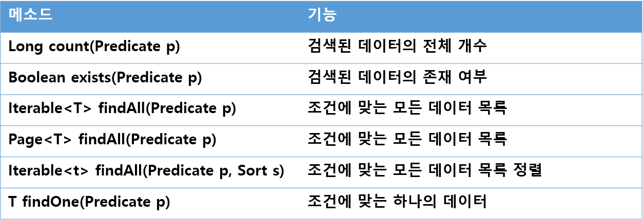 DynamicBoardRepository에서 QuerydslPredicateExecutor를 추가했기 때문에 사용할 수 있는 메소드가 다음과 같이 증가했다. 해당 표를 보면 공통적으로 Predicate를 인자로 사용하며 이 Predicate 인터페이스를 구현한 게 BooleanBuilder 클래스이다.