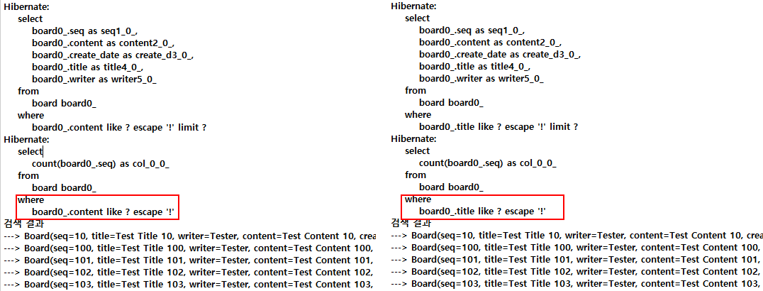 searchCondition을 왼쪽은 “CONTENT”로, 오른쪽은 “TITLE”로 지정했고 searchKeyword는 왼쪽은 “Test Content 10”, 오른쪽은 “Test Title 10”로 설정해서 실행한 결과이며 두 쿼리가 다르다는 것을 볼 수 있다.