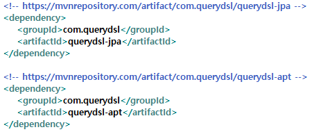 QueryDSL를 사용하기 위해 pom.xml에 다음과 같이 작성하여 라이브러리를 사용한다. 특정 버전을 사용하려면 <version>을 추가하면 되지만 <parent> POM에서 이미 라이브러리의 버전을 명시되어 있기 때문에 없어도 된다.